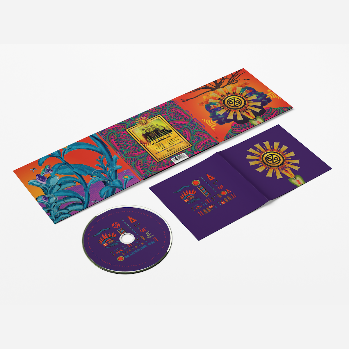 Of the vividly stunning album cover forMarching On, Raúl explains, “This figure represents the origin of the human race, an earthly mother who over time continues to store, carry, and share collective knowledge. She shares this knowledge through many faces and many pairs of eyes, representing all the varying cultures of the world, they are all from the same body, the same source. This mother figure, like the human race, is choosing to continue to move forward, she compels us to keep Marching On and remember our collective connectedness.”